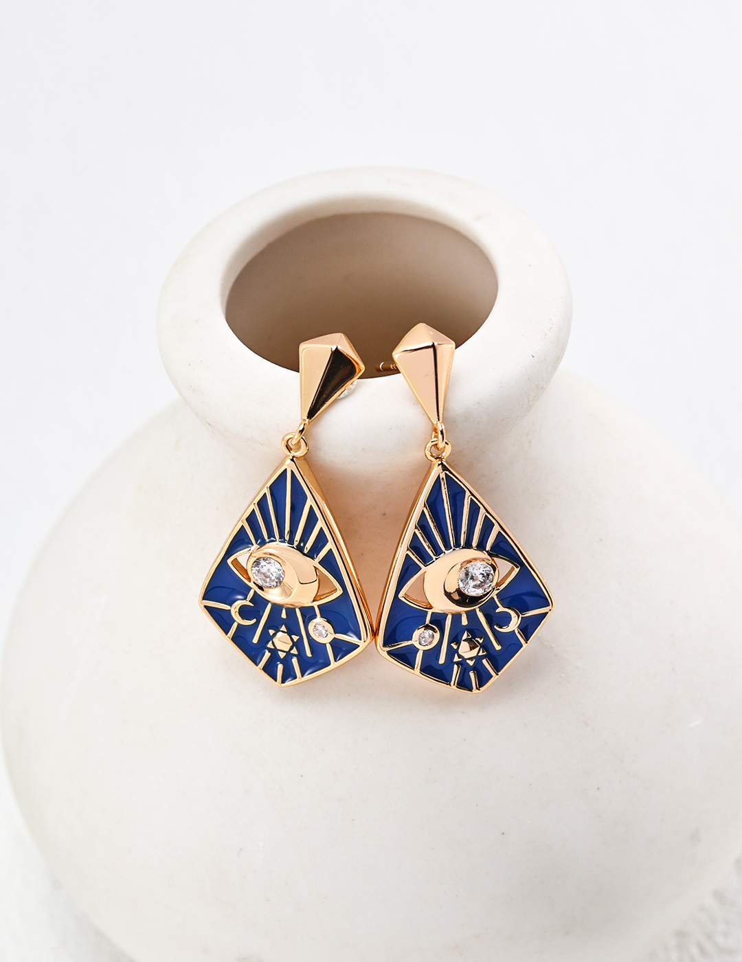 The golden frames beautifully contrast with the blue enamel glaze, reminiscent of the brightest stars in the night sky, shimmering with captivating allure. This collection masterfully blends ancient symbolism with contemporary elegance. Whether worn individually or paired for a coordinated look, these earrings are designed to spark conversation and captivate, offering a unique fusion of classical beauty and modern style.