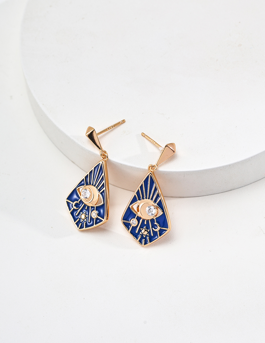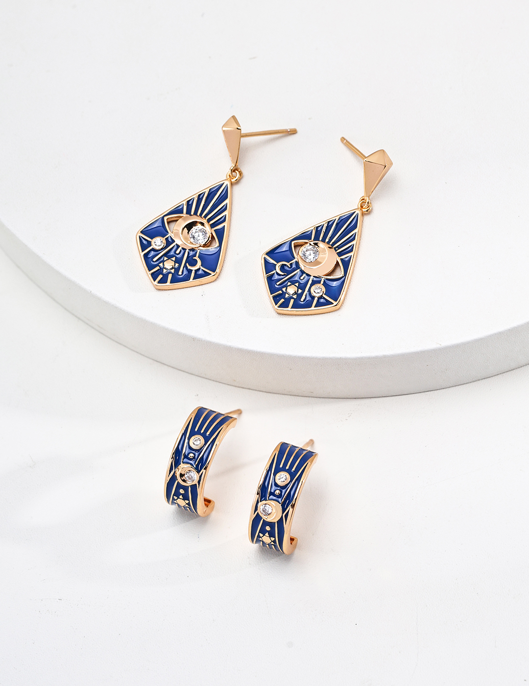 The Dangle Earrings showcase a powerful eye motif, surrounded by delicate starbursts and glittering zircons, designed to offer protection and insight. Complementing these are the Huggie Hoops, featuring a sleek, curved design illuminated by sparkling zircons and a celestial pattern against the vibrant blue glaze.
